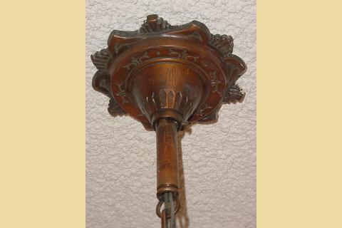 Original and rare vintage copper finish intact. Signed M.E.P. for Markel Electrical Products. Great copper color to match the warm interiors of the old Bungalow. Shades in excellent shape. Intact antique lighting fixture for any renovation, restoration, or remodel.