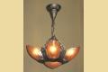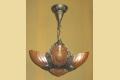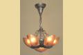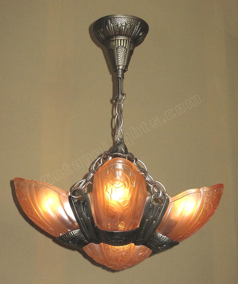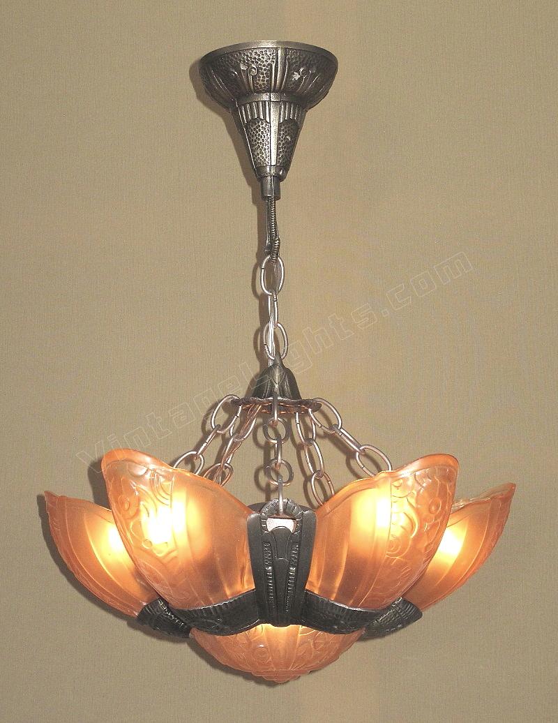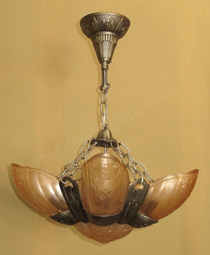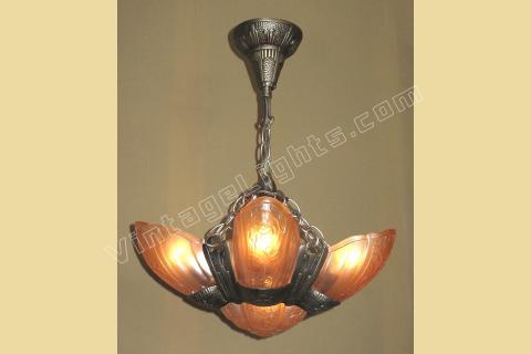The largest of the "Fleurette" series by Lincoln is this 6 slip shade fixture with 7 bulbs. Two bulbs light up the bottom piece of glass. Refinished to match one of the original finishes offered at the time of manufacturer, around 1928.