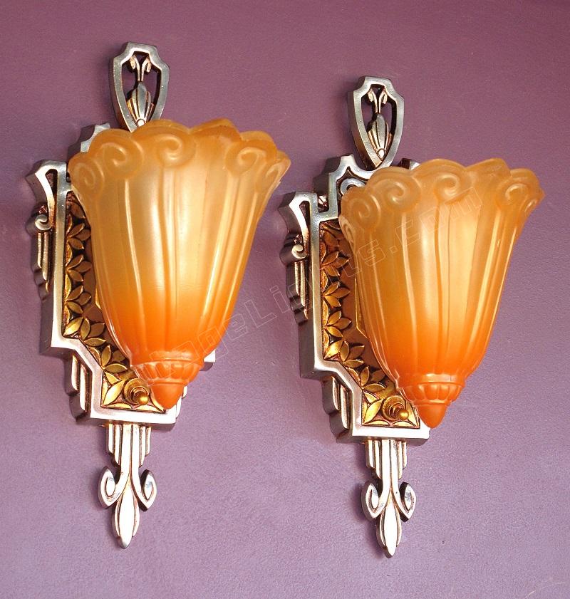 Restored to their original glory with highly polished aluminum accents and sides, repainted in their original color of sunset golden highlighting the spectacular Art Deco design, and original orange tinted shades. New sockets, wiring and new painted on/off switches complete their restoration.