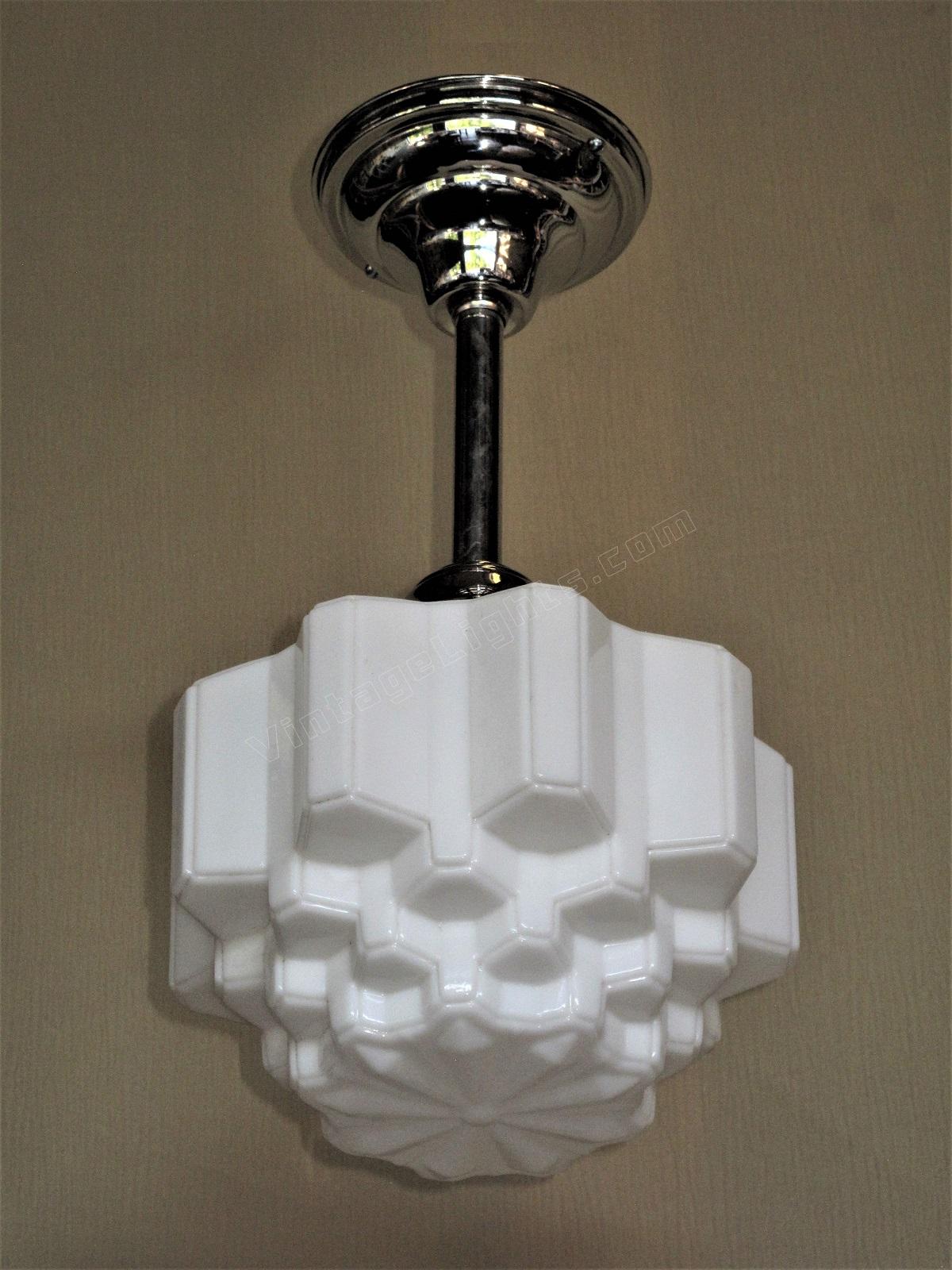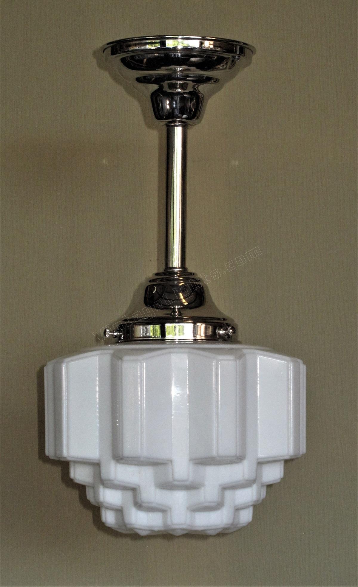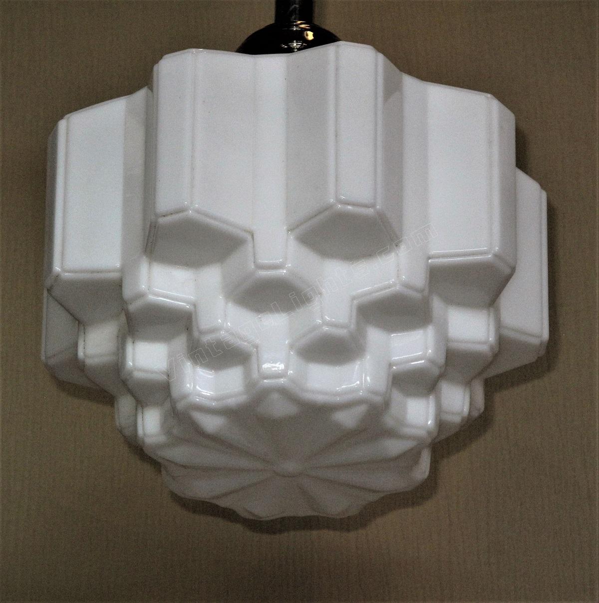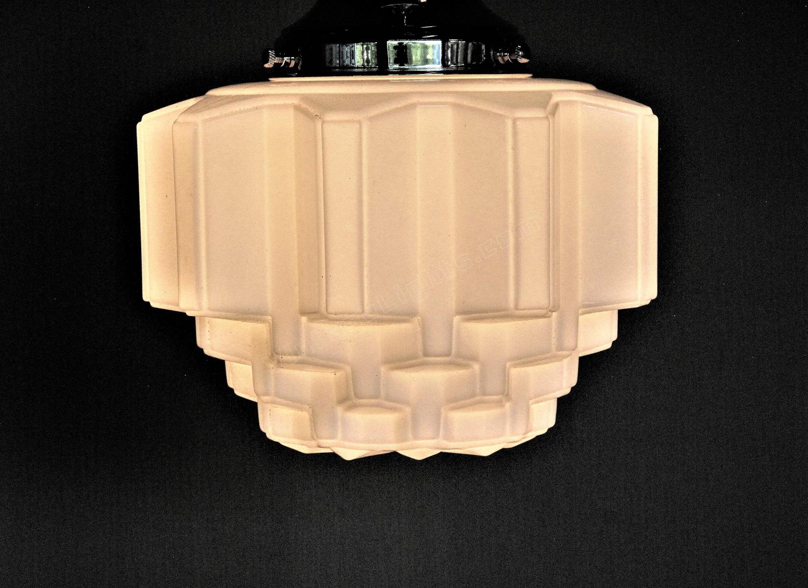 Mid size art deco milk glass globes, all in excellent condition with no cracks. The stepped design is sometimes referred to as a "wedding cake or skyscraper" design, commonly seen in Art Deco fixtures of their day. The vintage circa 1930 globes are shown on new polished nickel fitters, which can be changed to fit your needs,
