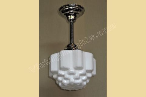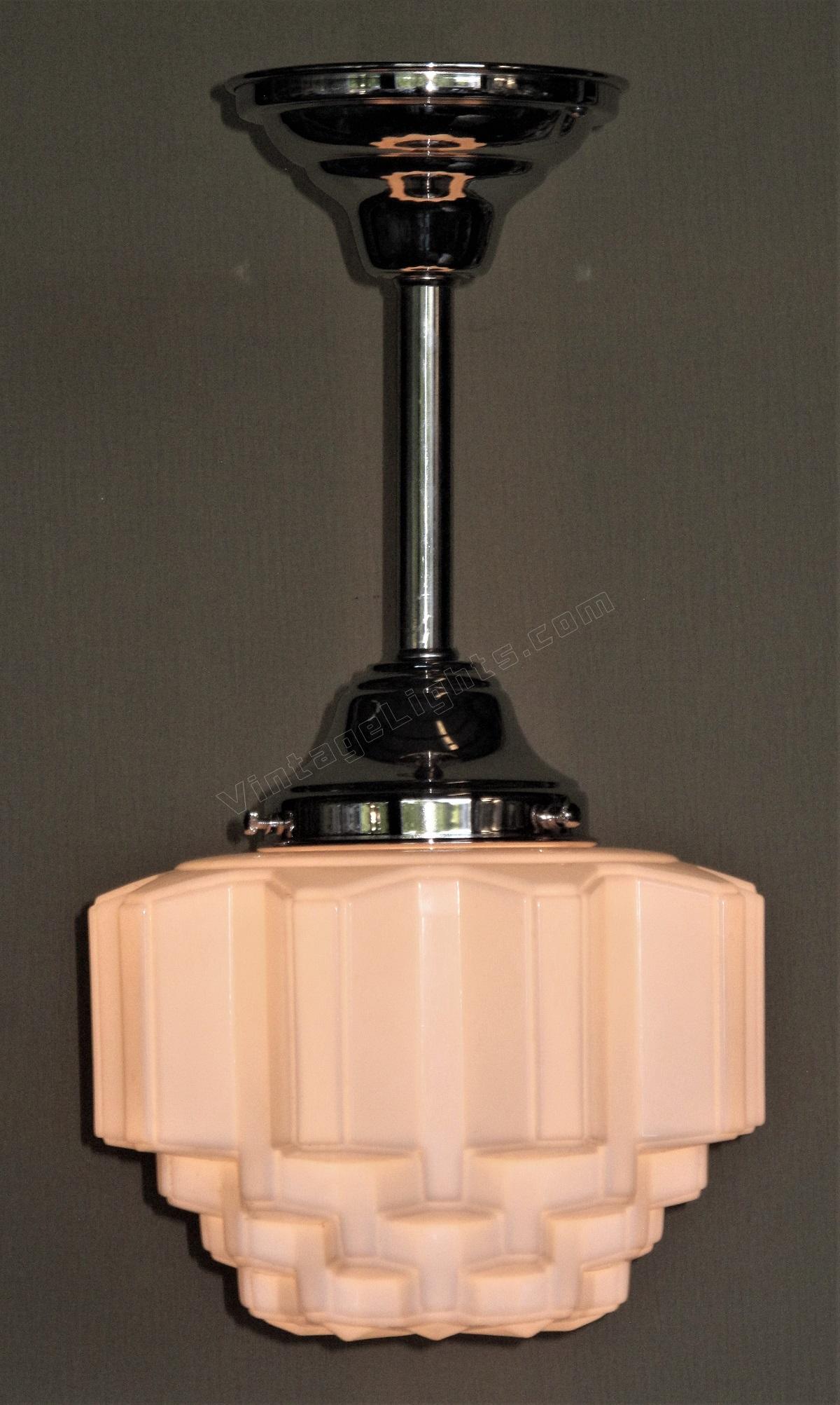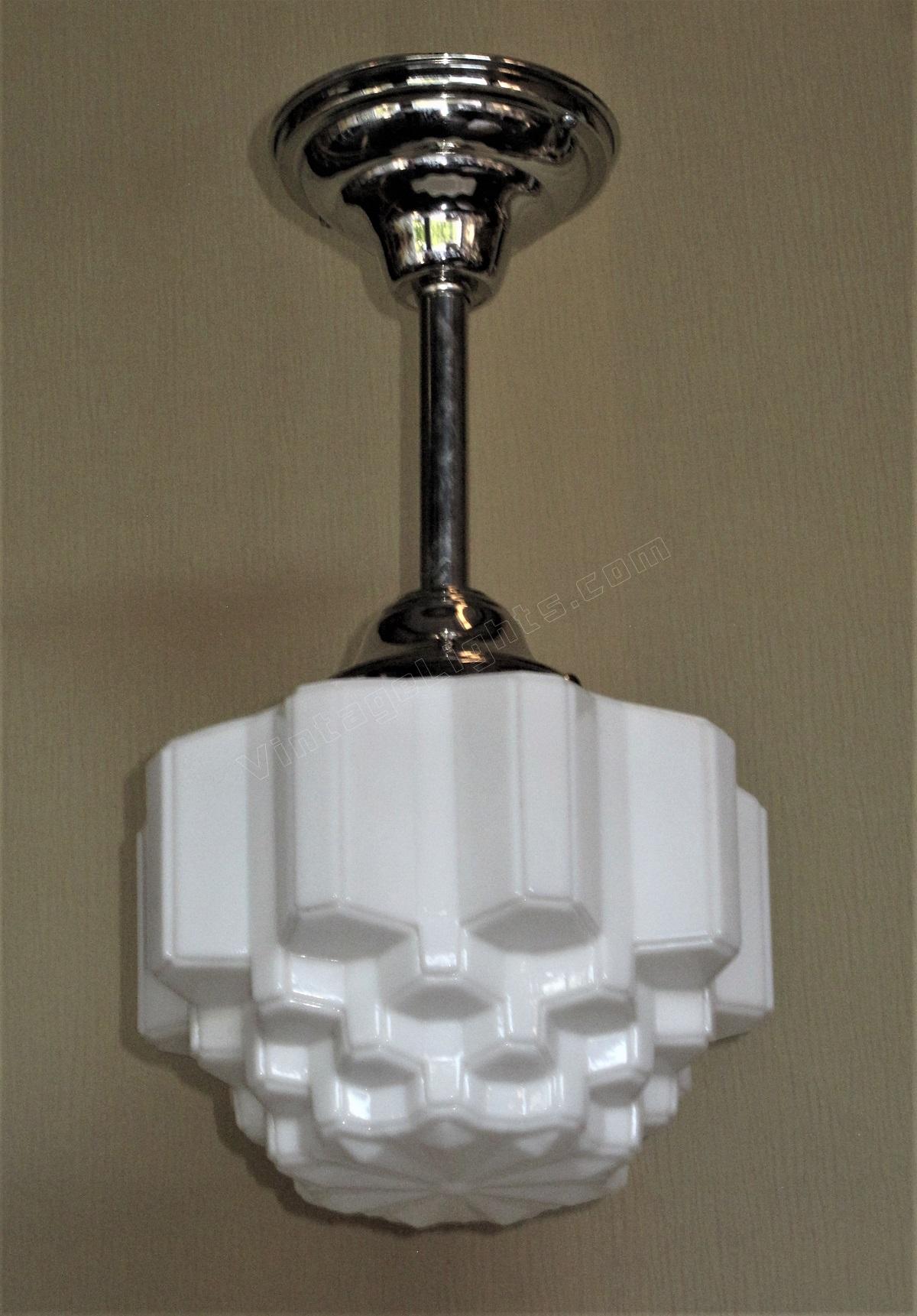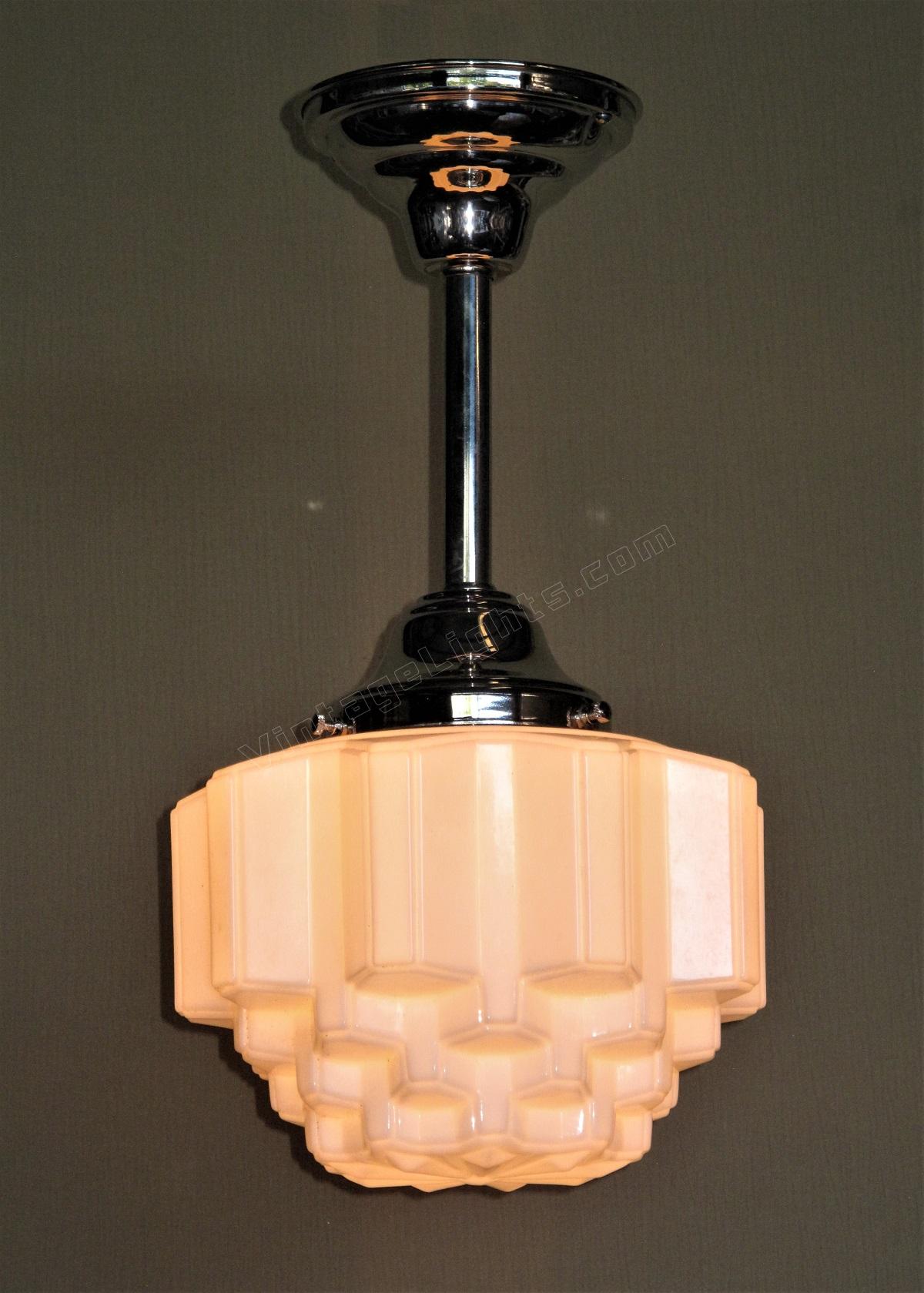 Mid size art deco milk glass globes, all in excellent condition with no cracks. The stepped design is sometimes referred to as a "wedding cake or skyscraper" design, commonly seen in Art Deco fixtures of their day. The vintage circa 1930 globes are shown on new polished nickel fitters, which can be changed to fit your needs,