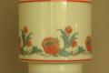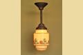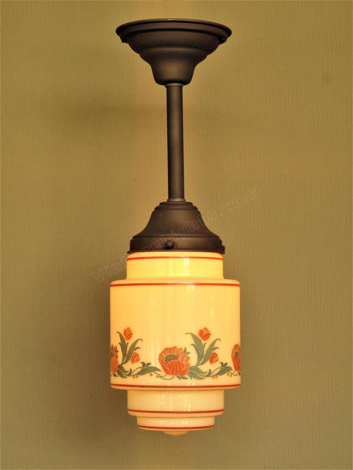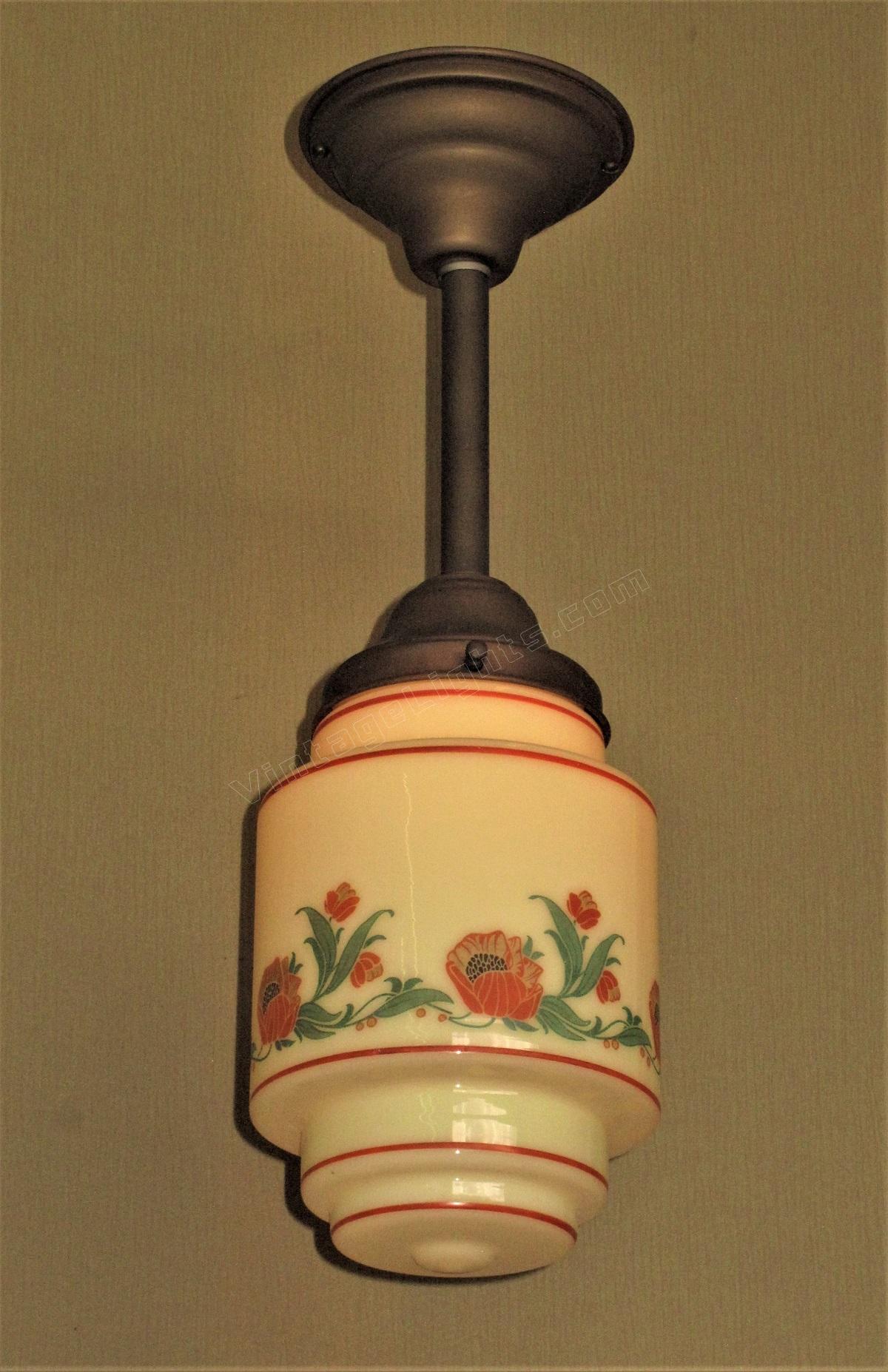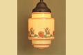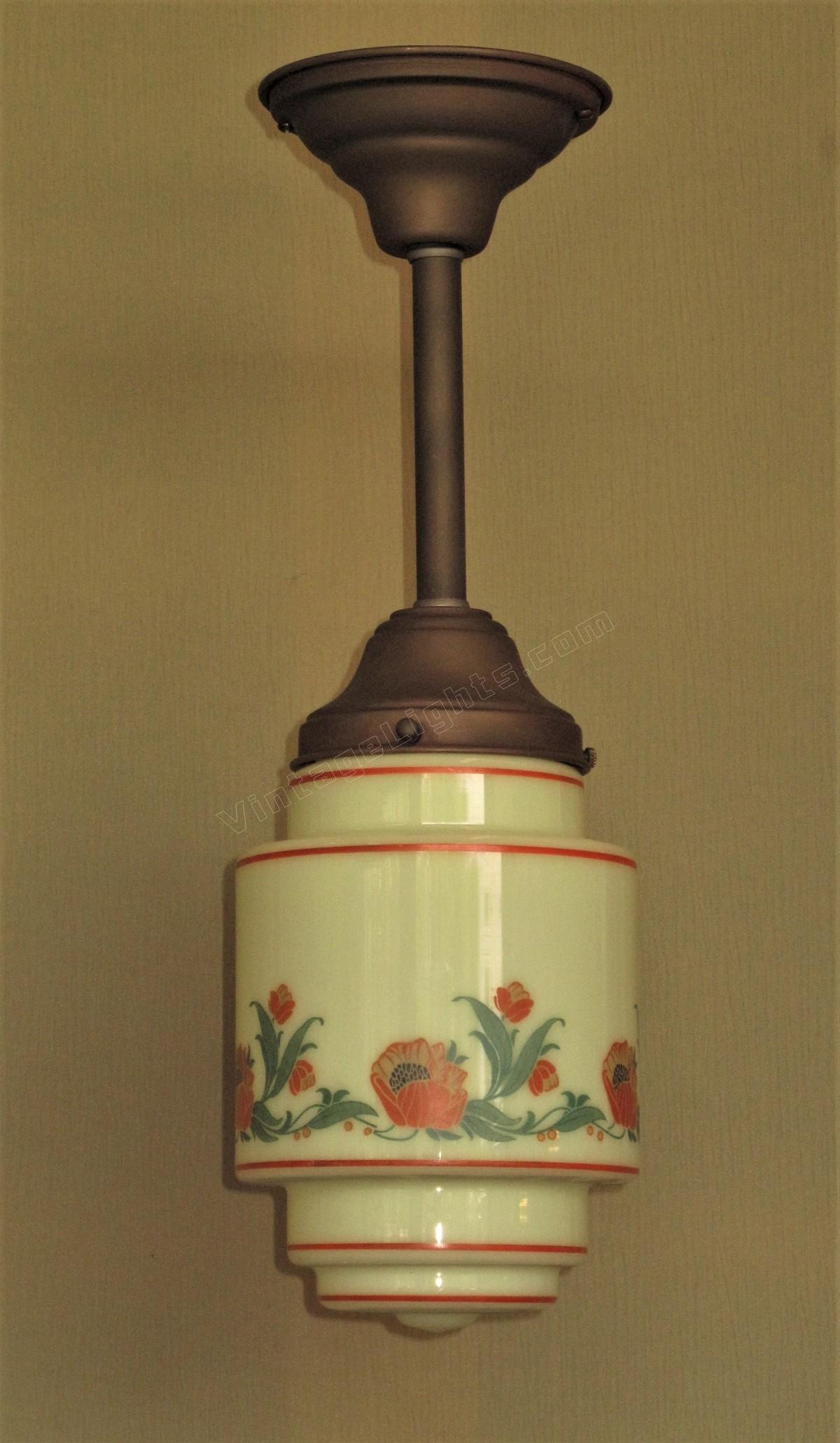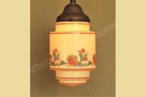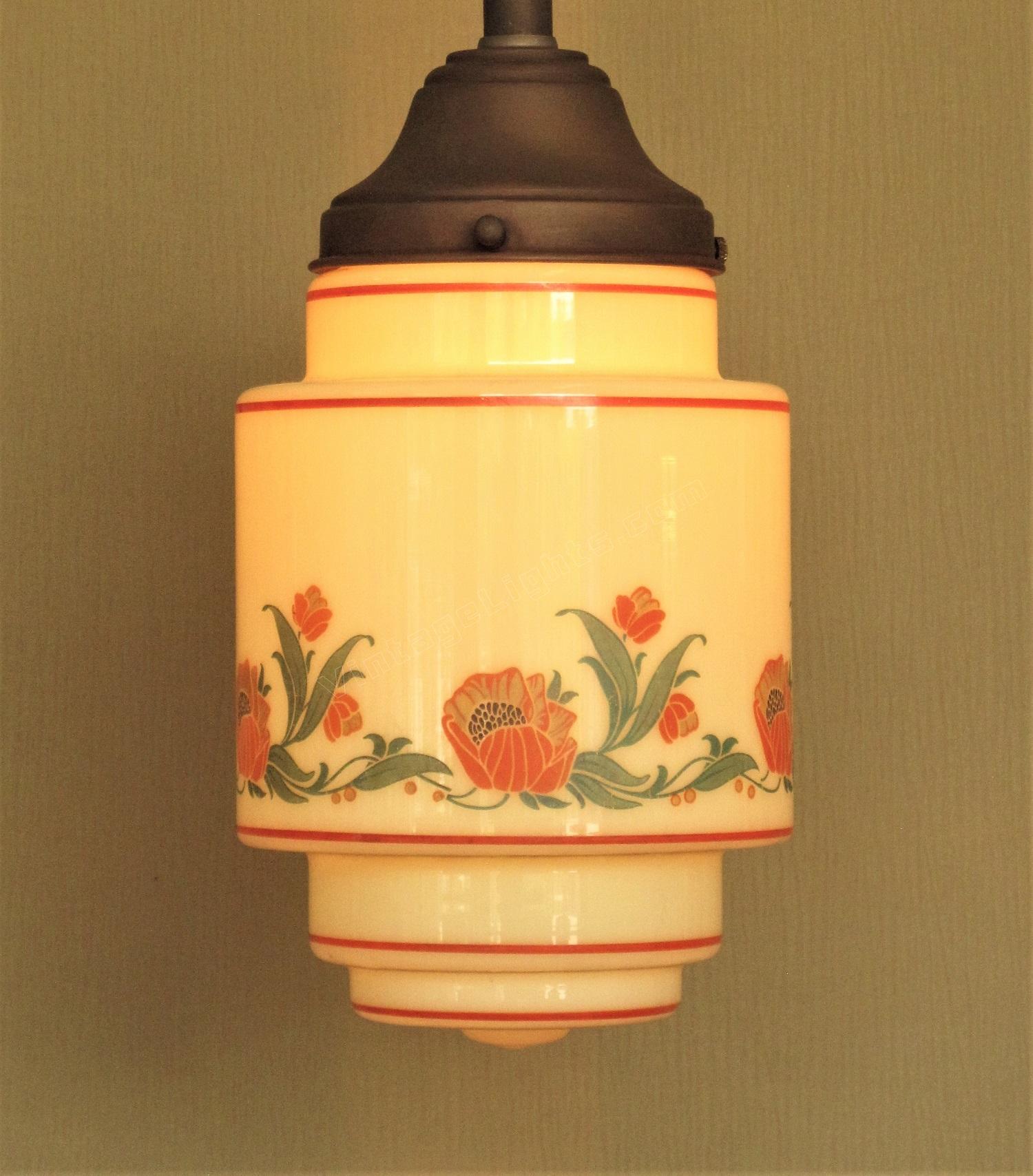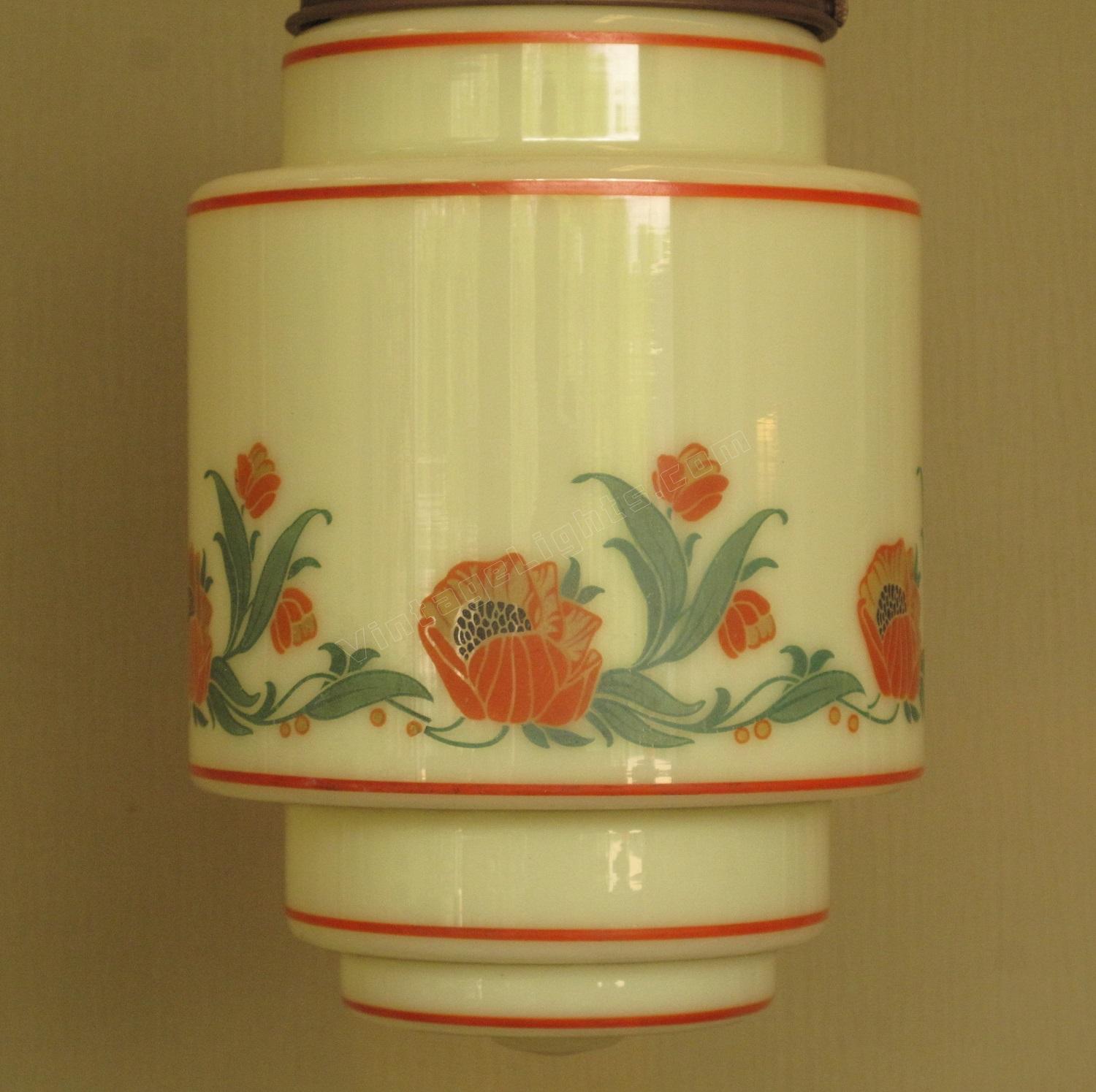 An Art Deco shaped stepped custard globe with a ring of golden poppies ring the bottom of the center panel. The stepped panels are highlighted with rings of the golden orange color of the poppies. A wonderful color scheme with the delicate flowers against a background of custard glass. Very beautiful either lit or unlit.