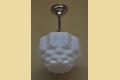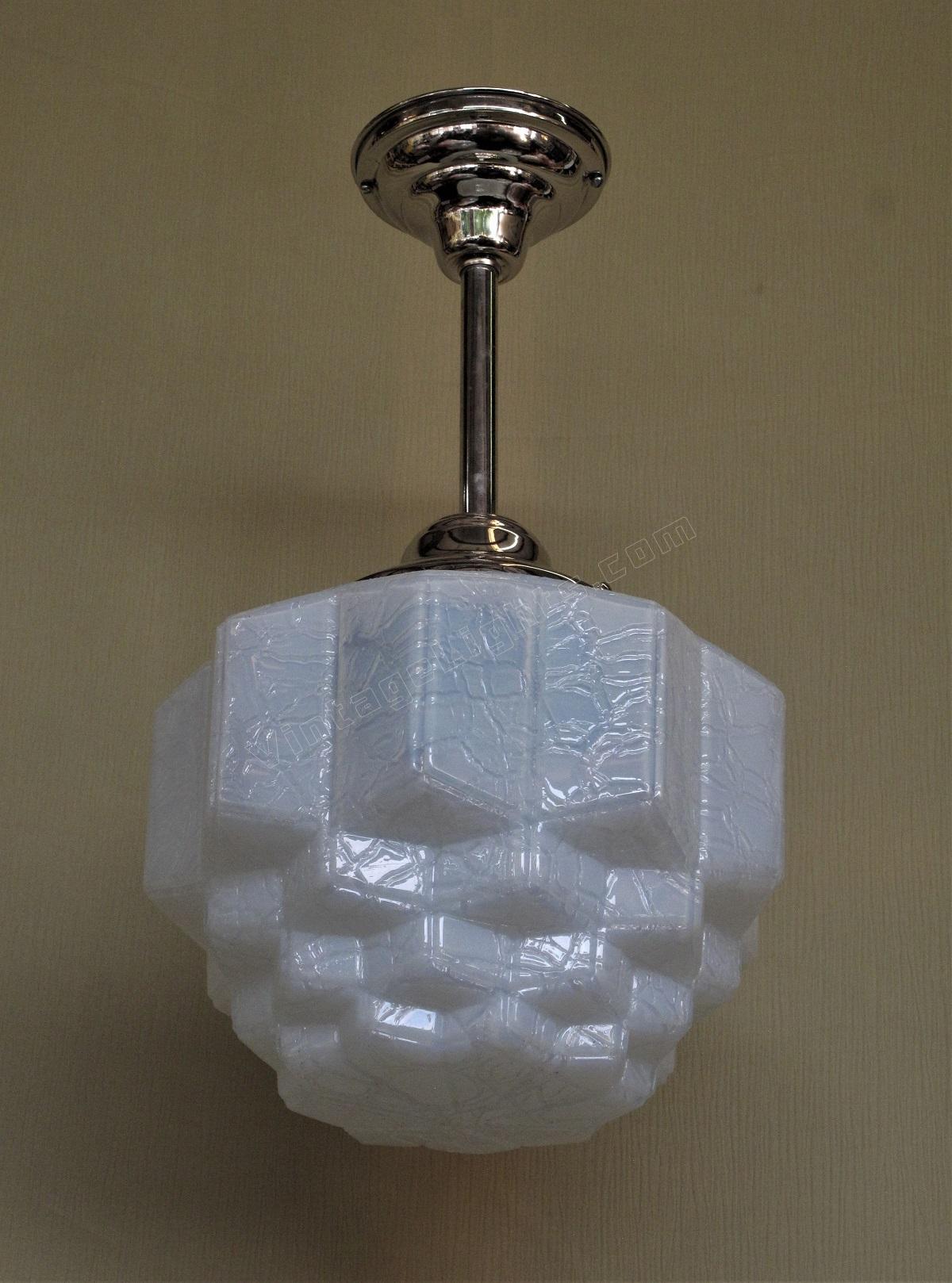A wonderfully unique treatment to these shades from the Art Deco period. The crackle finish adds a huge amount of visual interest along with the coloration and a milky hue to the entire globe. The crackle finish is achieved by dunking the still hot, formed shade briefly into water where the outside of the glass cools and shrinks but the inside remains hot and plastic enough not to crack all the way through.