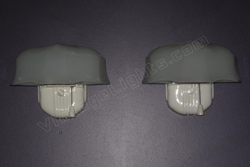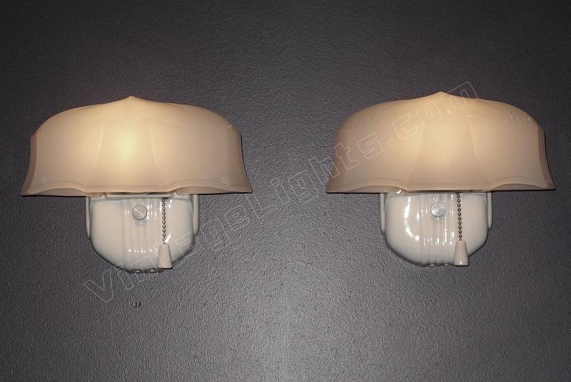 This pair from the 20s is in remarkable condition with only a small manufacturing defect at the top of one fixture, hidden behind the shade. (You can tell a small void like this in the finish is from the factory is the way the the glaze rolls down into the void, clearly seen when the light hit it just right. No sharp edges were the glaze meets the void).