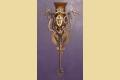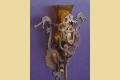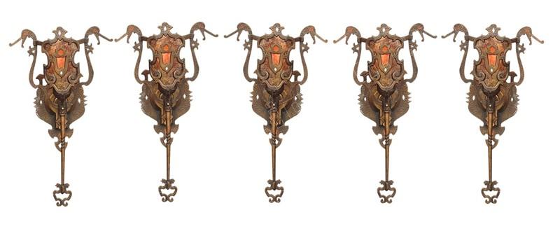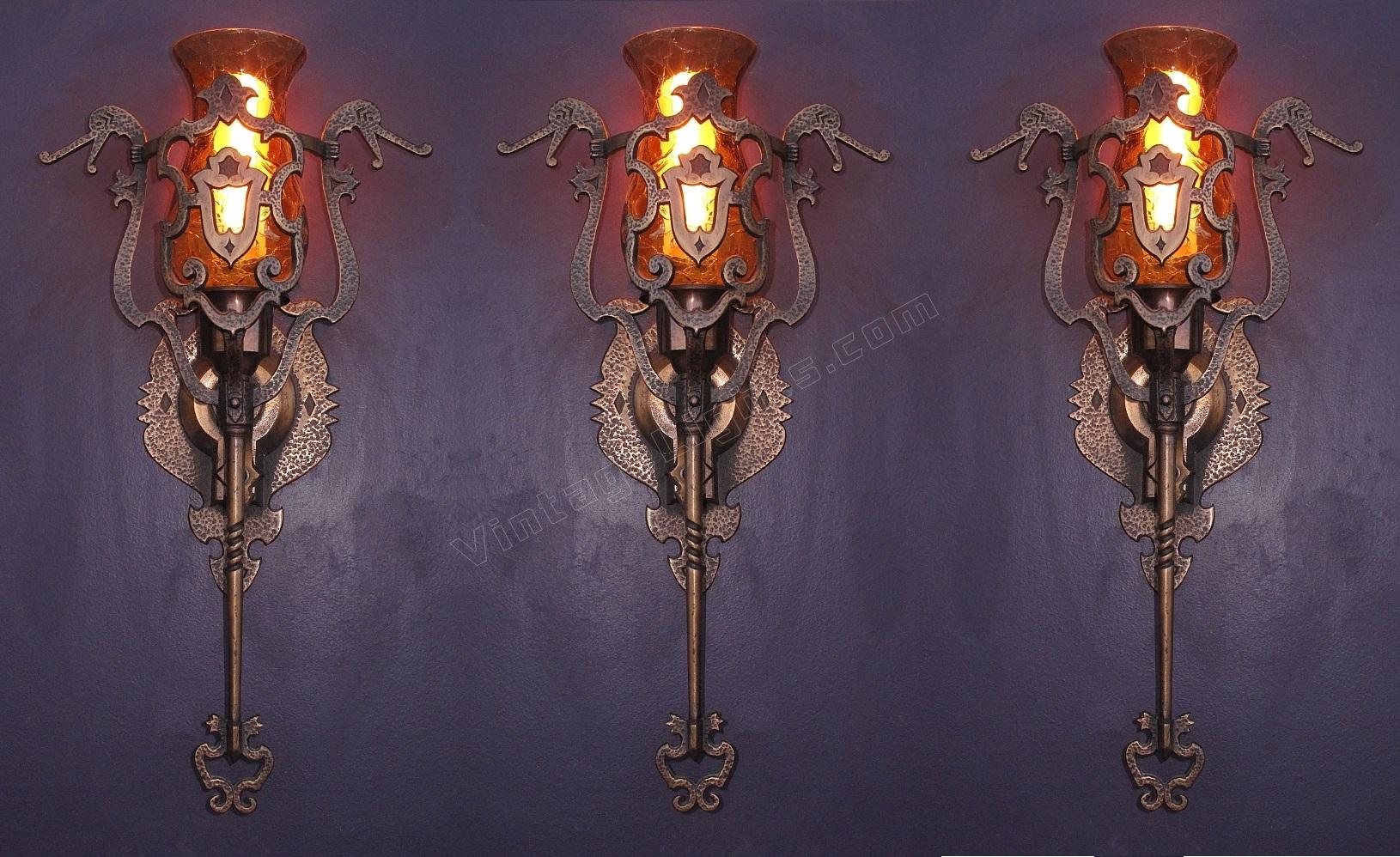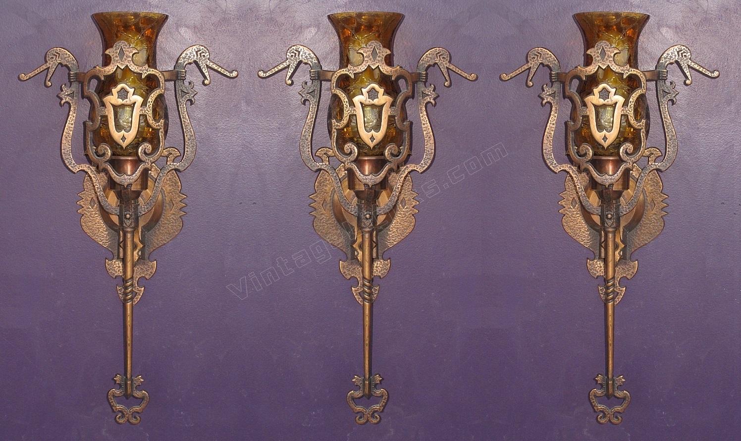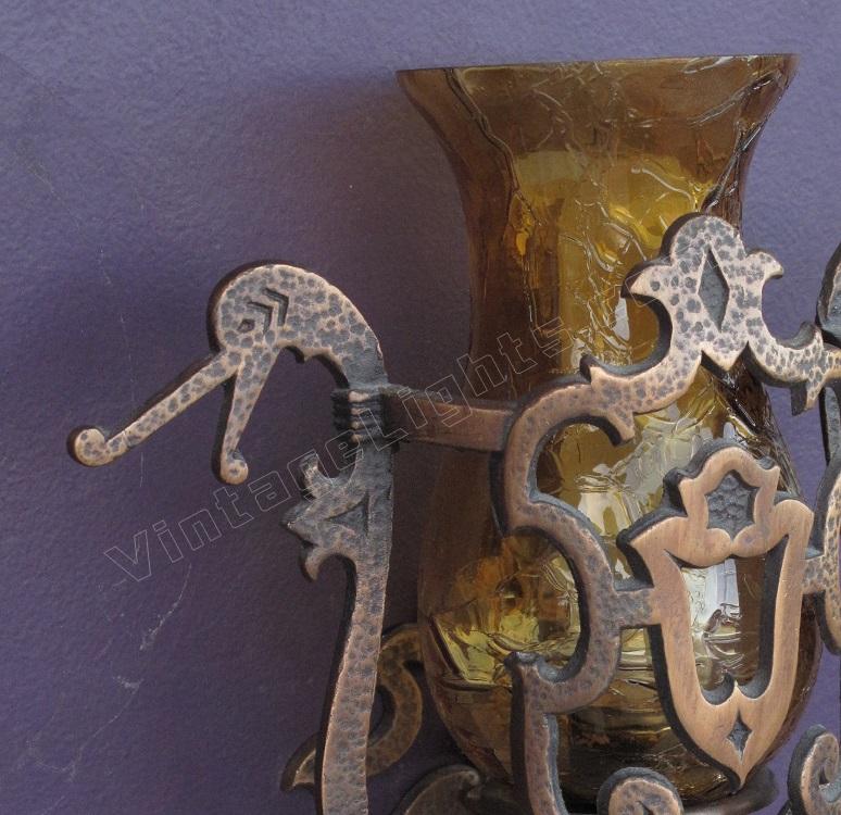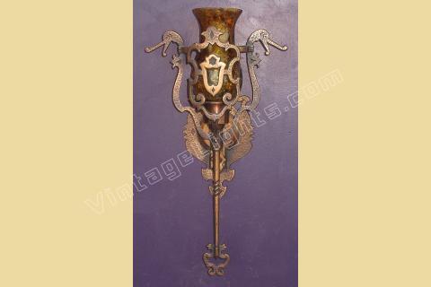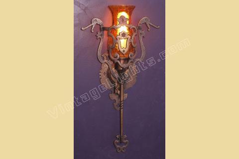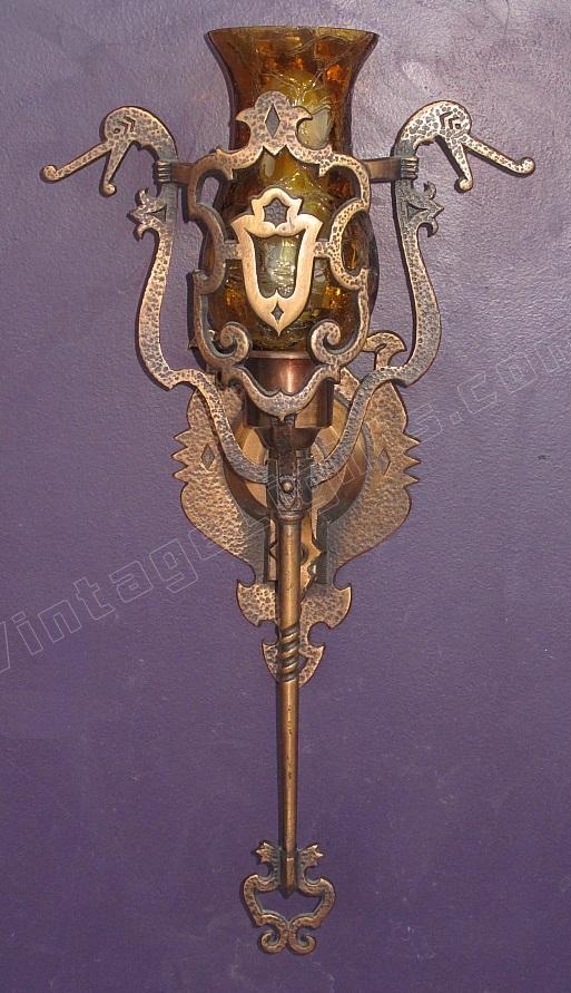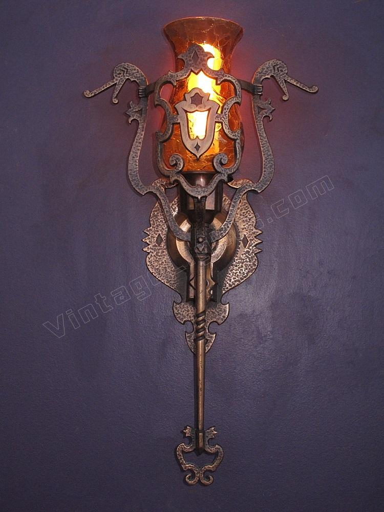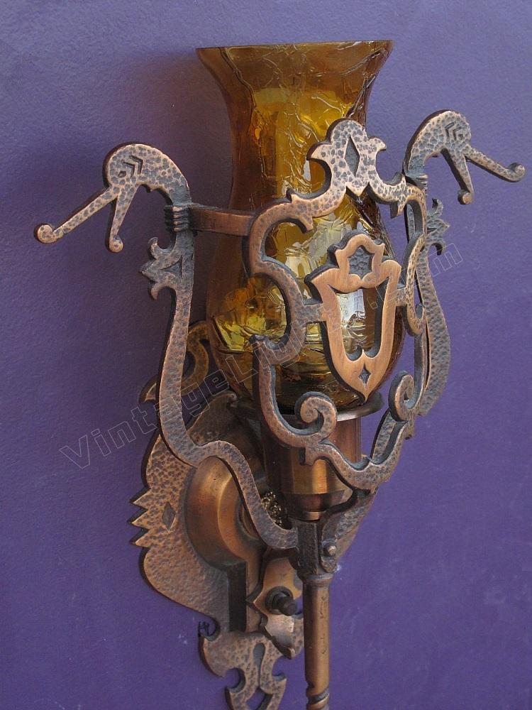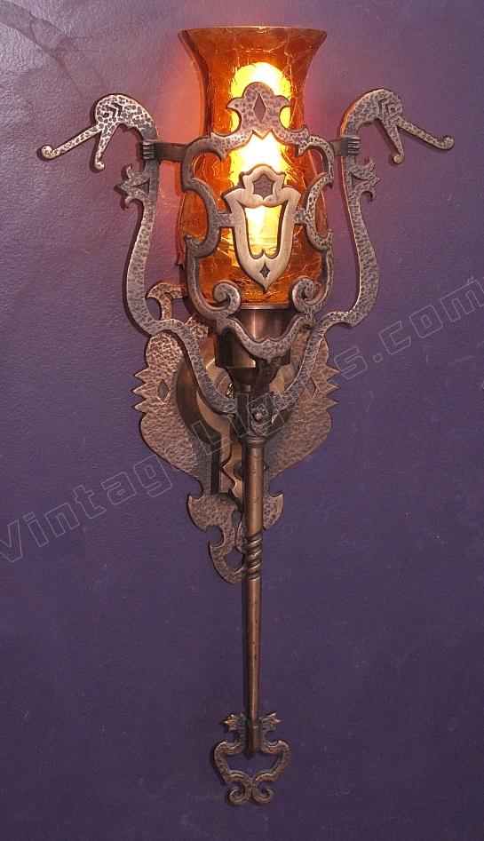 This vintage wall sconce is rarely found with its original shades intact. Great Spanish revival styling with dragons, crests, shields, hammered finish, and cast hand wrought look. We especially like the arms coming from the shields with their hands having a firm grip on the dragon's neck, keeping them at bay (see close up). Either crackle glass shade or mica bulb shield available.
