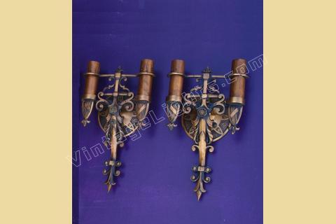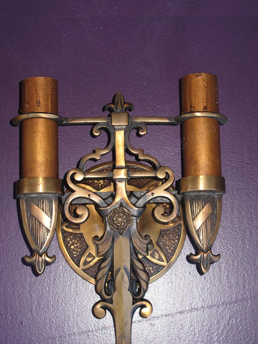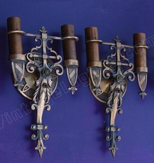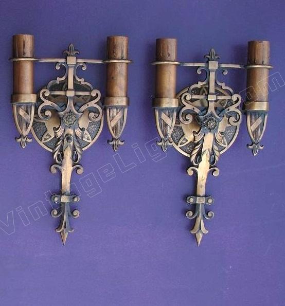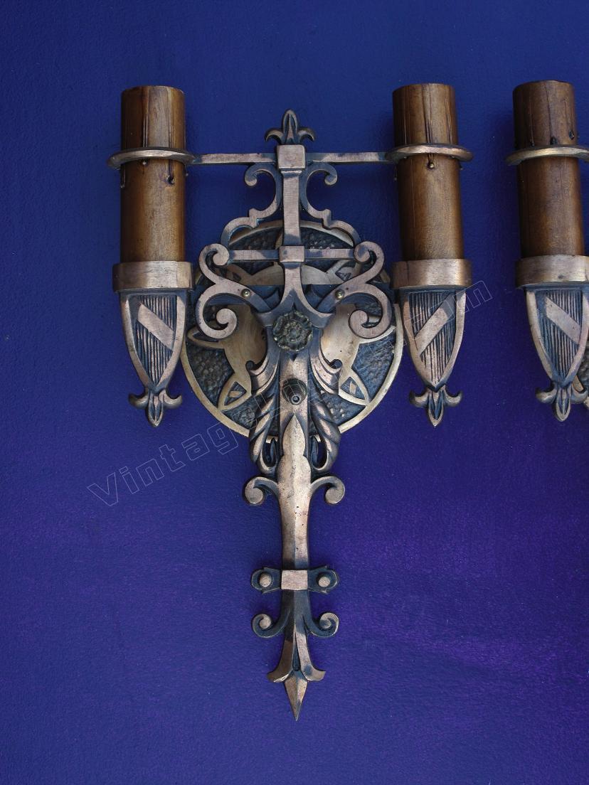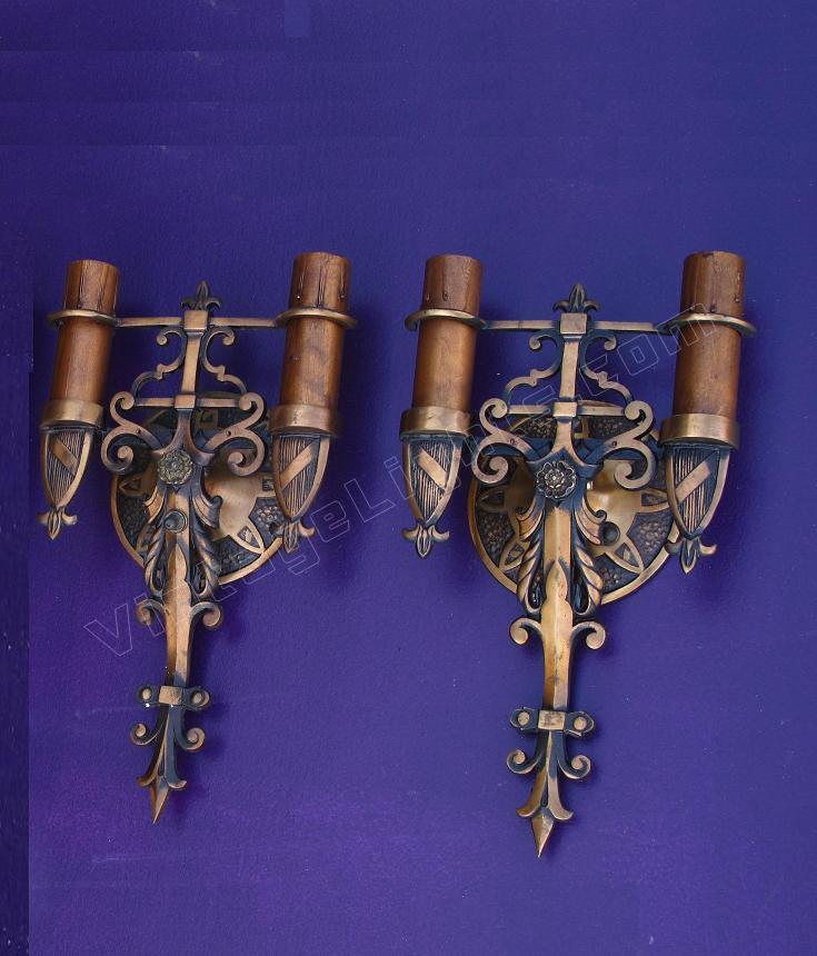 Solid bronze substantial antique wall sconces. Top quality casting and regal in design. These will add class to any home interior. Spanish Revival and Tudor in feel.