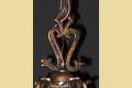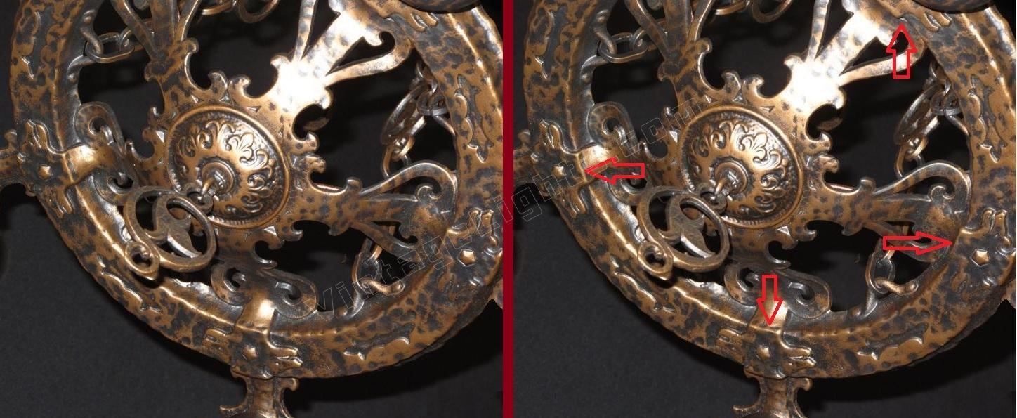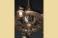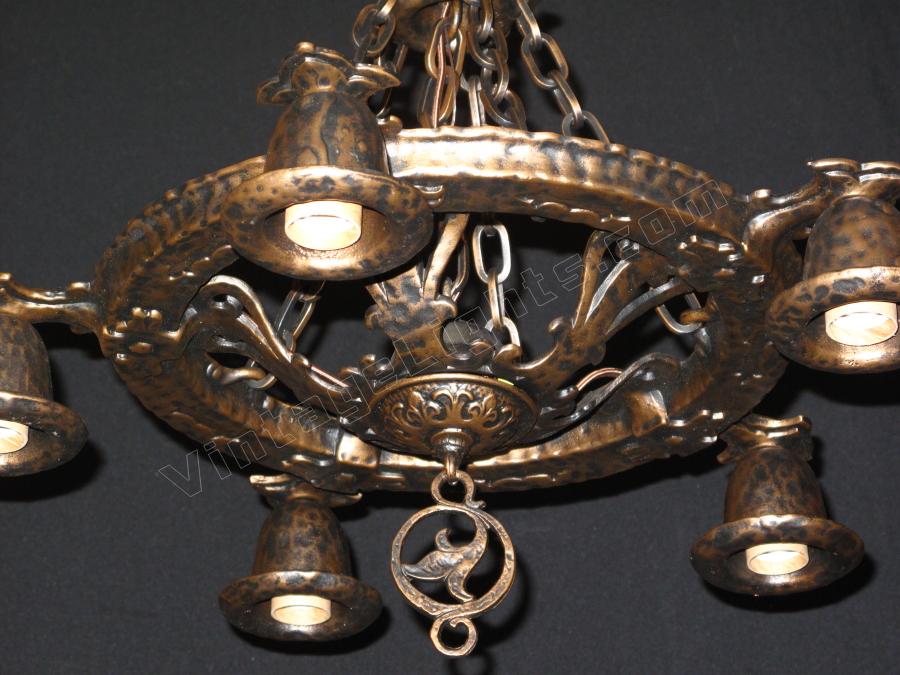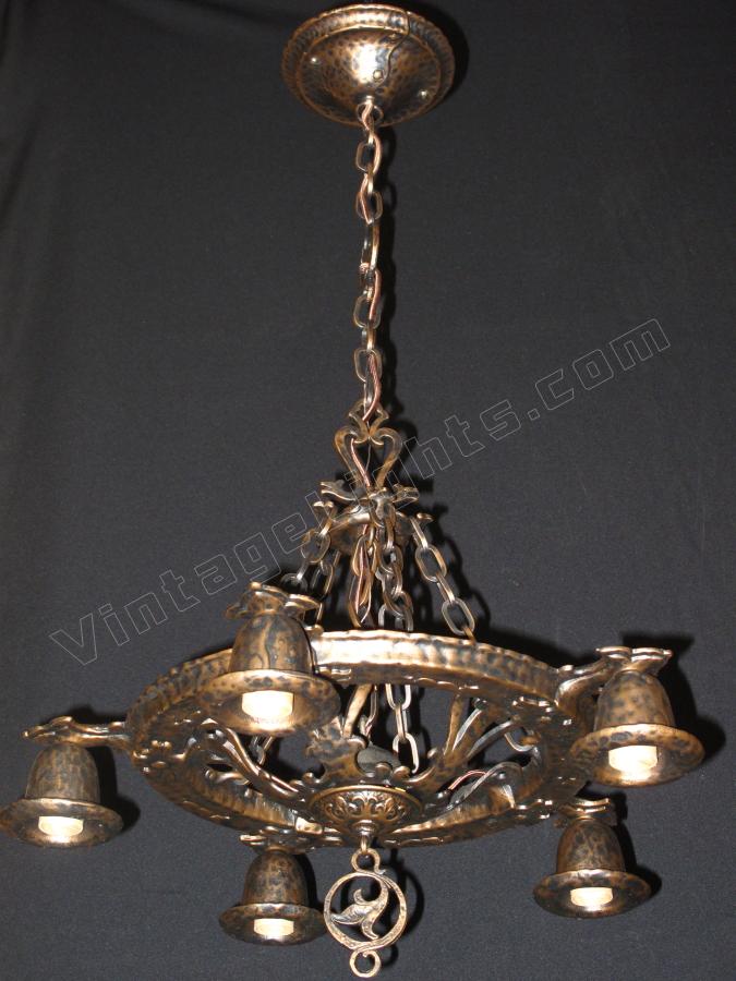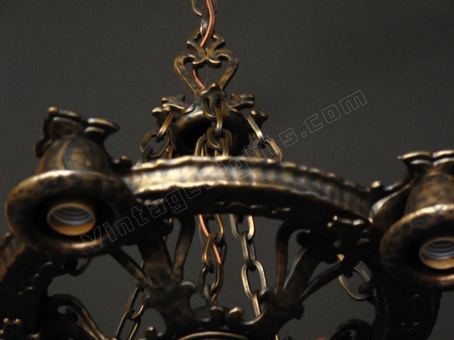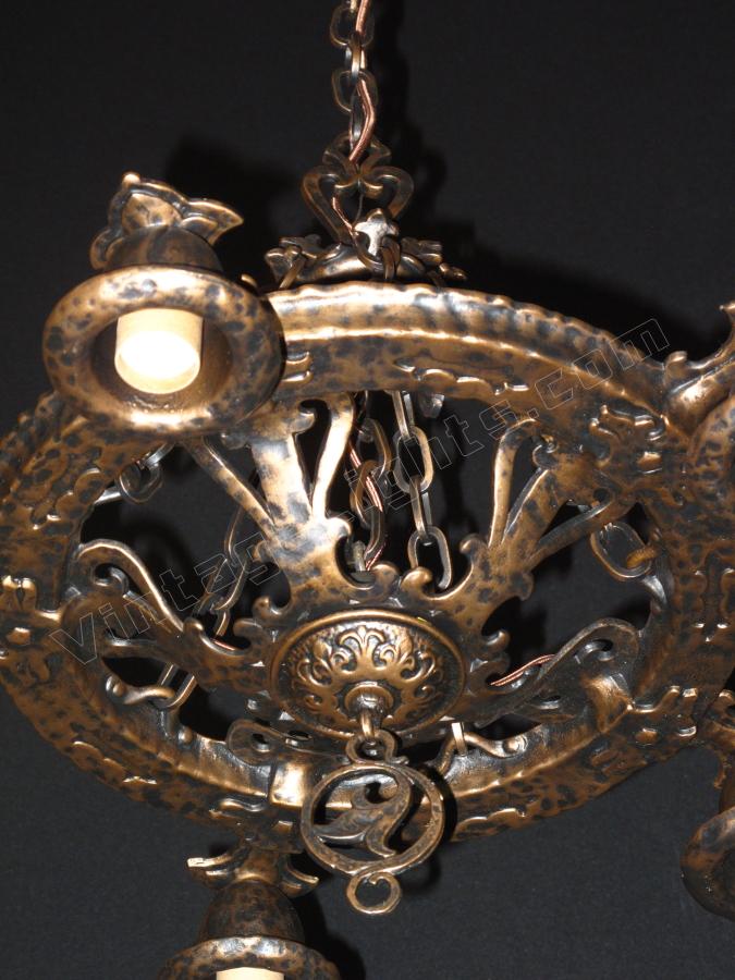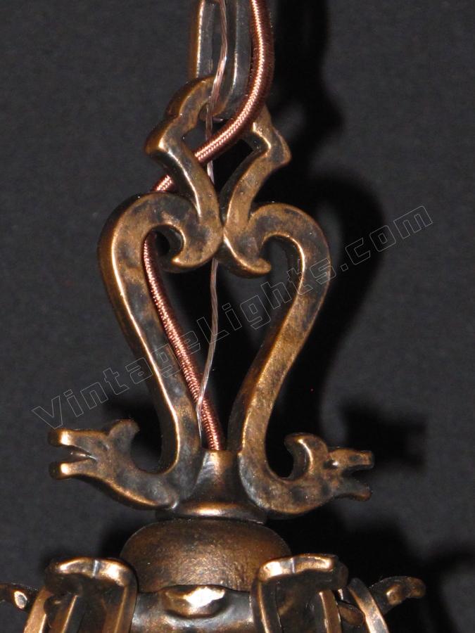 Another whimsical "Dogs Head" antique light fixture from Virden, Milwaukee. Finished to match all other vintage Dogs Head fixtures in an antique Bronze color. Minor differences between a couple of these vintage fixtures in the chain detail. This line is equally at home in an Arts & Crafts or Spanish Revival environment.