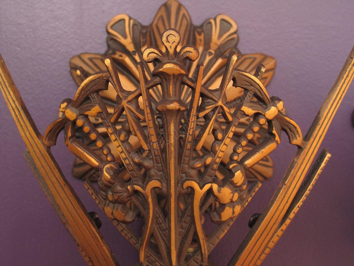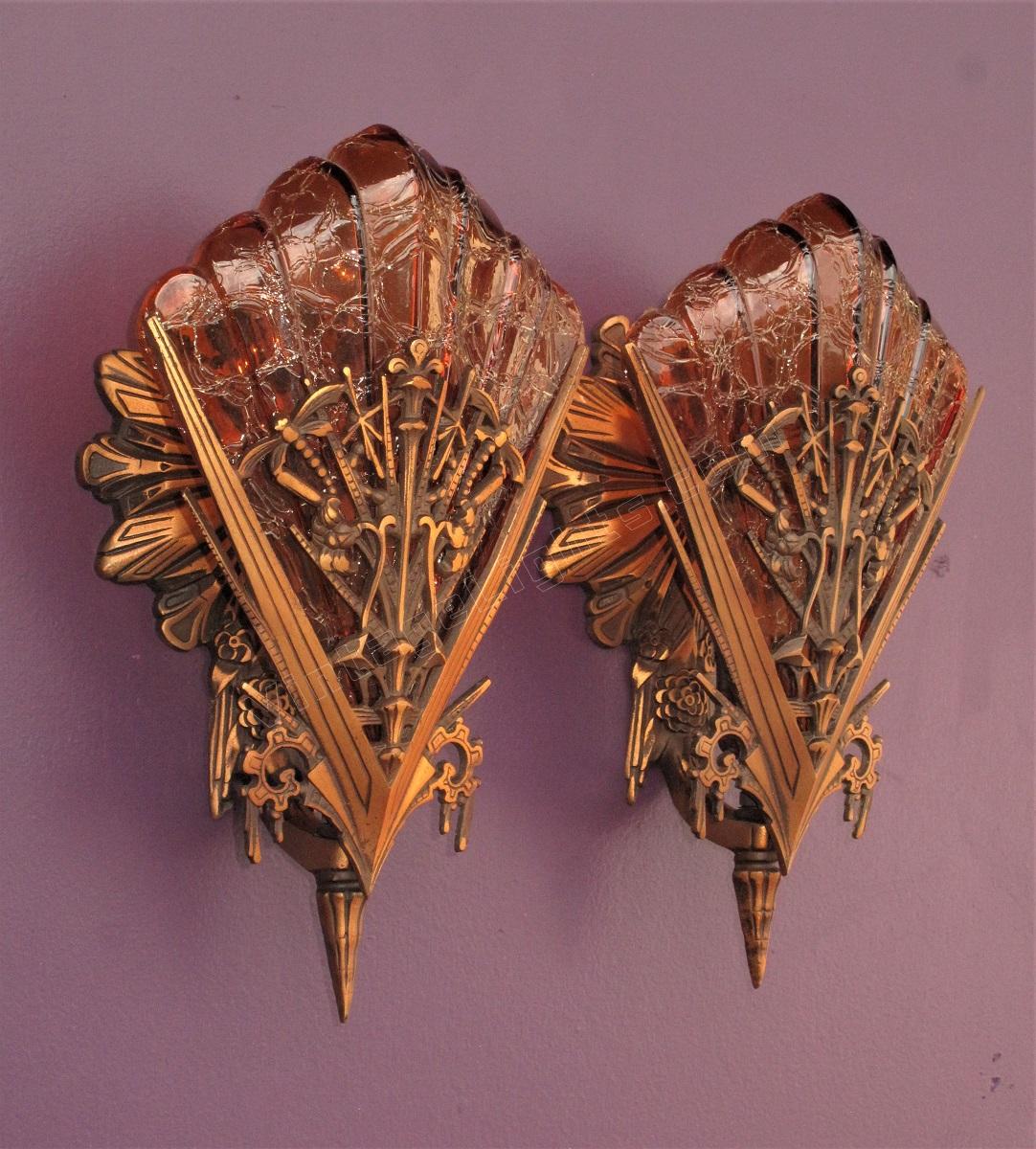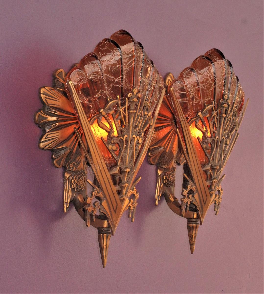 Scarce Pair Bronze Dragonfly Sconces w/ Rootbeer colored slip shades