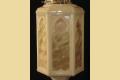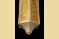 Moorish or Keyhole arches at the top of each panel and a Trinity star at the bottom. Milk glass bodies with a fired on pattern of rainbow colors. Matching larger ceiling fixtures and matching sconces also available.