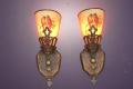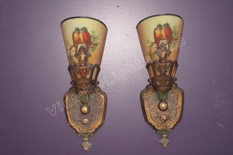 Bird Lovers - Vintage pair antique wall sconces with Parrots. Refinished backs to match original colors of light bronze with light green and red highlights. The paint on the slip shades are in remarkable condition for being 80+ years old. Very little paint loss on the shades with no noticeable chips or cracks in the glass.