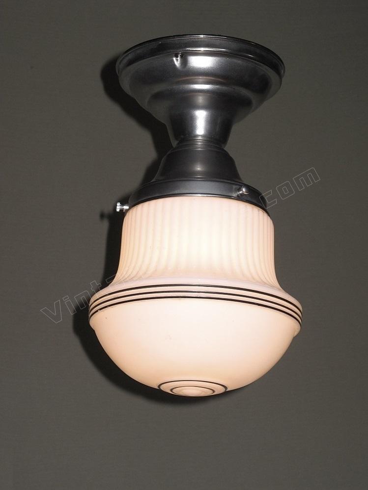 These older antique glass globes enjoy an Art Deco influence in design. Shown on new Nickel fitters. Nice black accent detail for a vintage inspired kitchen or bath in any bungalow or cottage. As with many of the milk glass shades of the 20s through the 40s, these also came in different sizes. We have 2 sizes available, as shown in the last image, and this one is the smaller one, perfect for a pendant over the kitchen sink or bathroom vanity.
