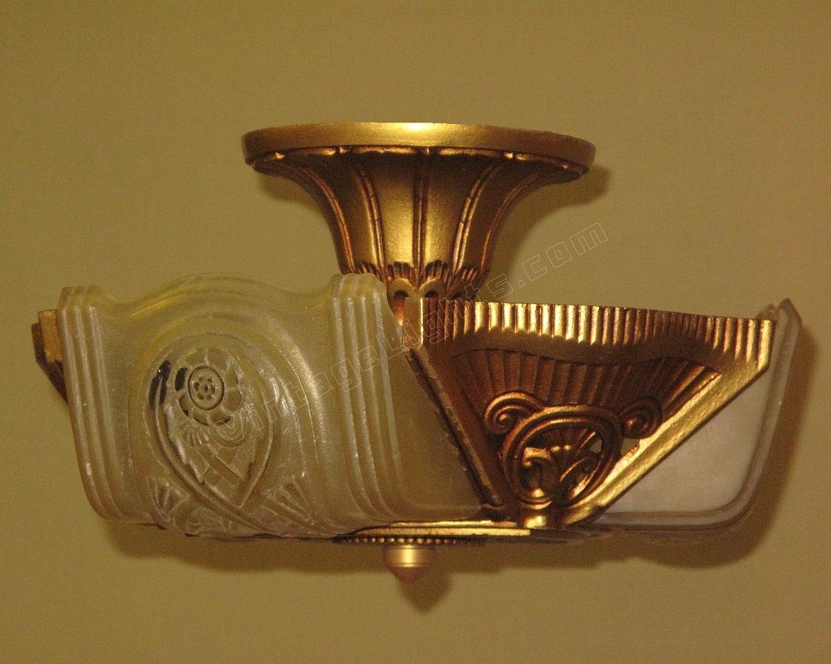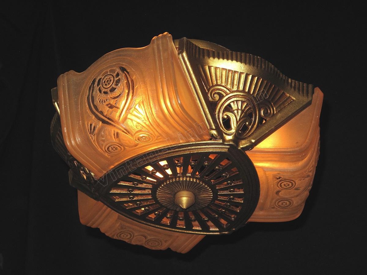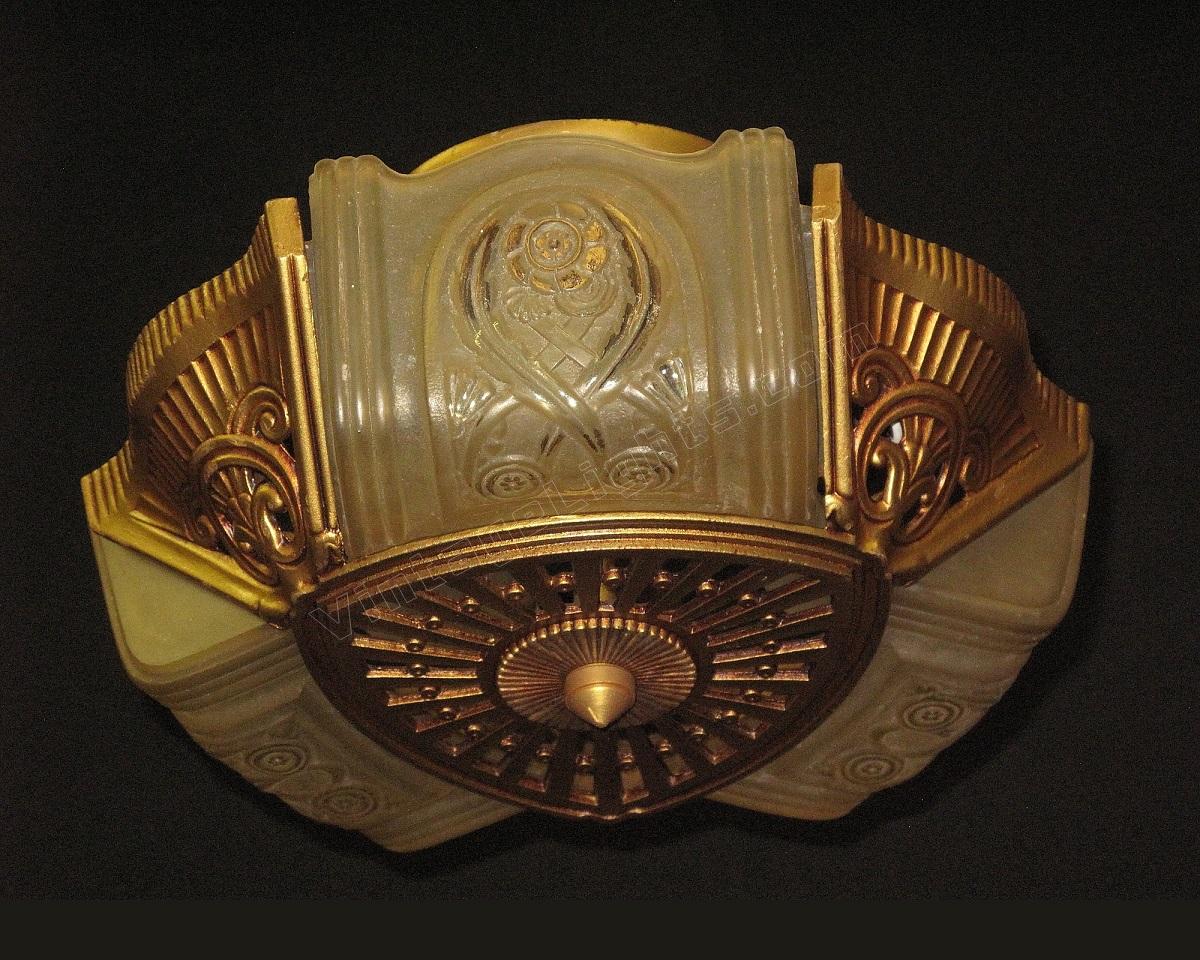 Wonderful Art Deco ceiling fixture refinished in it's original color of polychromed golden. Shades attributed to the Consolidated Glass Co.