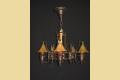 The fixture is made from cast iron and twisted and bent steel to give it a hand wrought look. The socket cups, bent steel strapping, ceiling canopy, and cartouches (bless you) all have a hand hammered look cast into them.