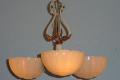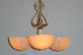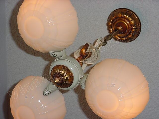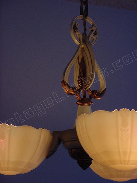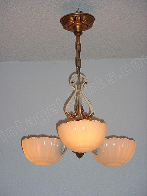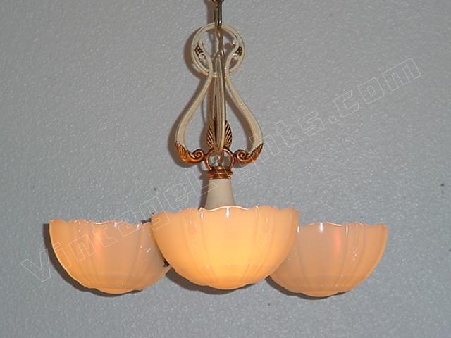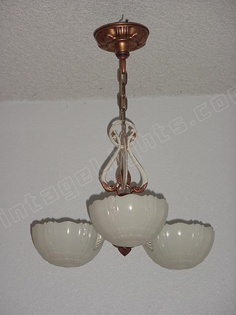 Refinished in its original colors of Cream and Antique Golden. This 3 shade fixture imparts the refined style of yesteryear's designers. Shades are of high quality "Custard" glass which shine orange or red when viewed at certain angles, also know as the shade's "fire". This early '30s design shows the influence toward the "Mid-Century" style. A classic. Length can be adjusted.
