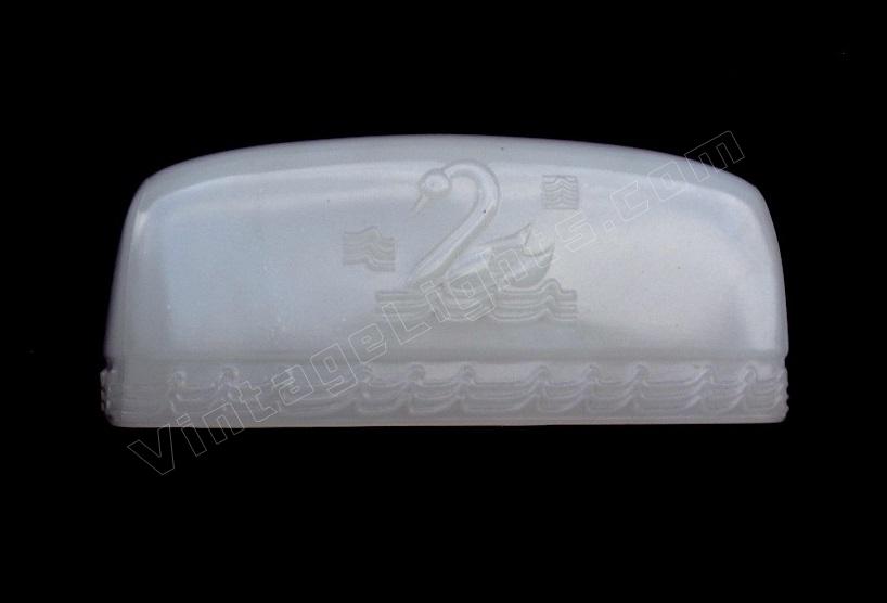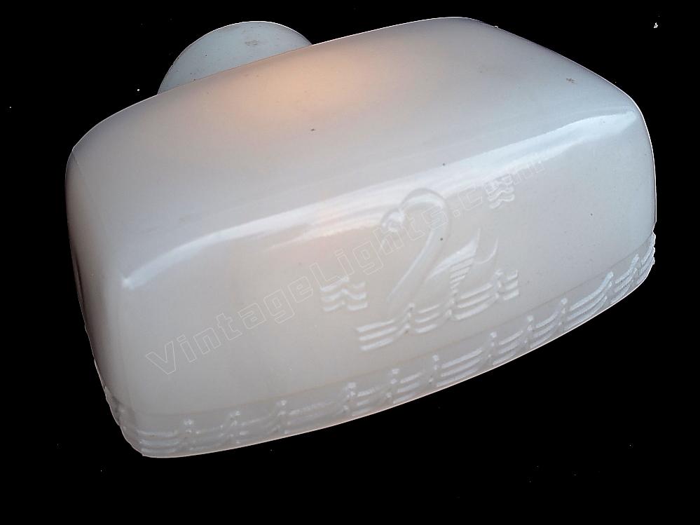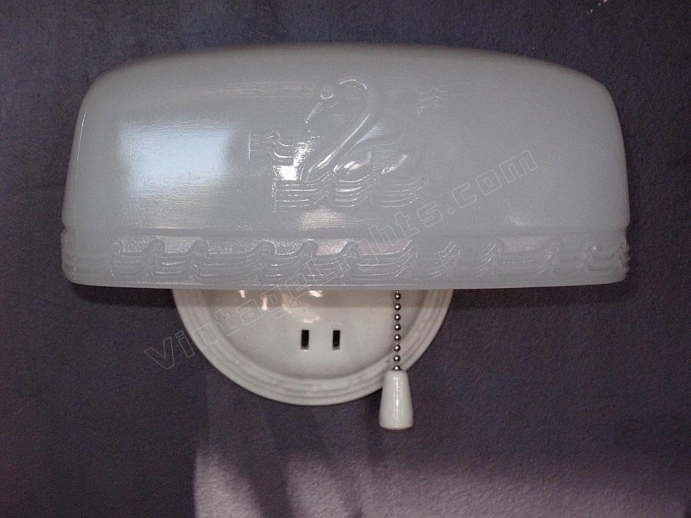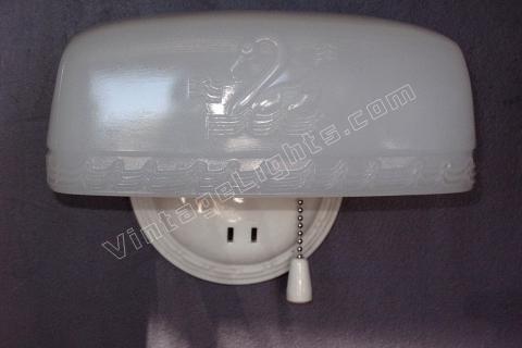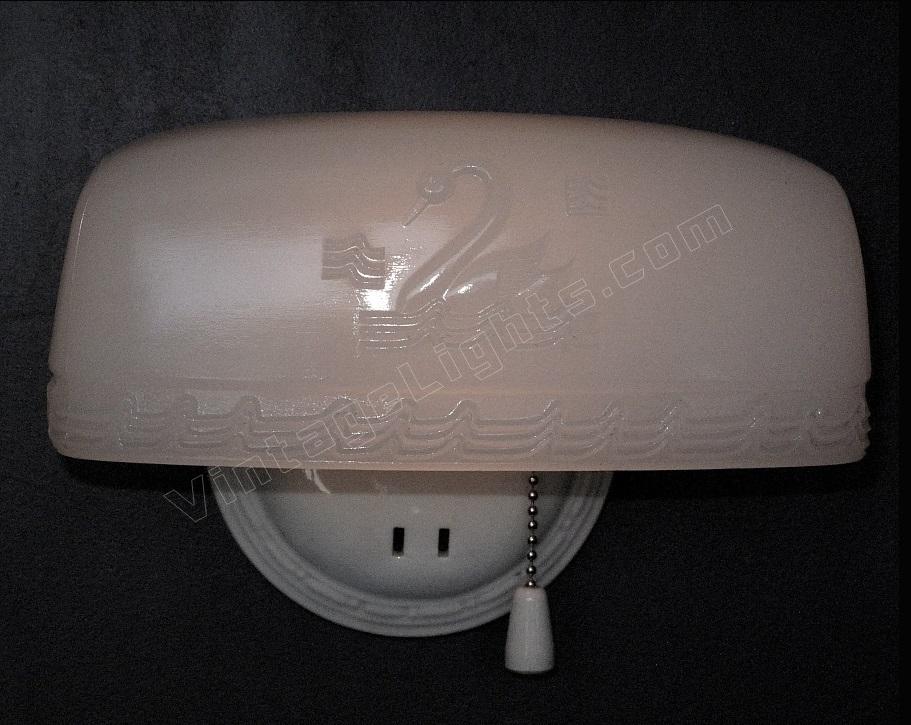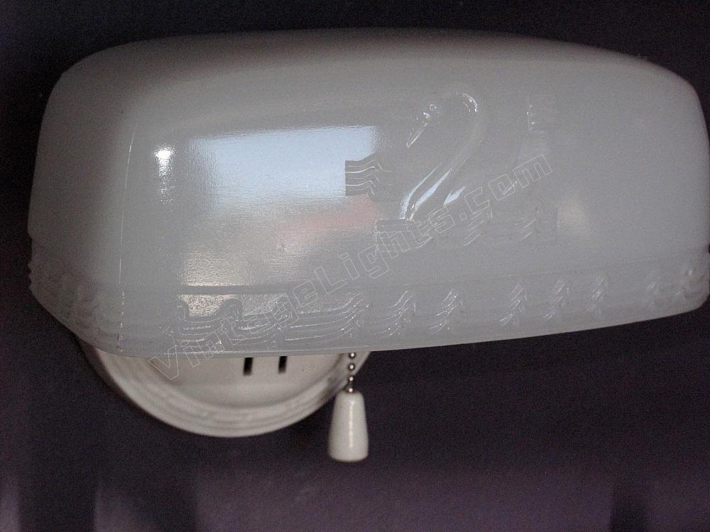 Nice addition to any bathroom is this vintage white porcelain fixture with an oversized shade with stylized swan gracing the front, along with waves along the bottom of the glass.